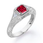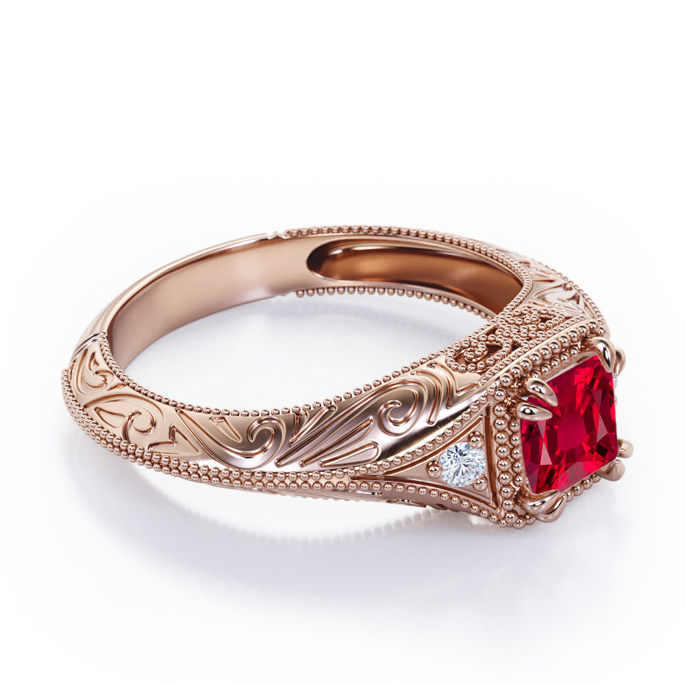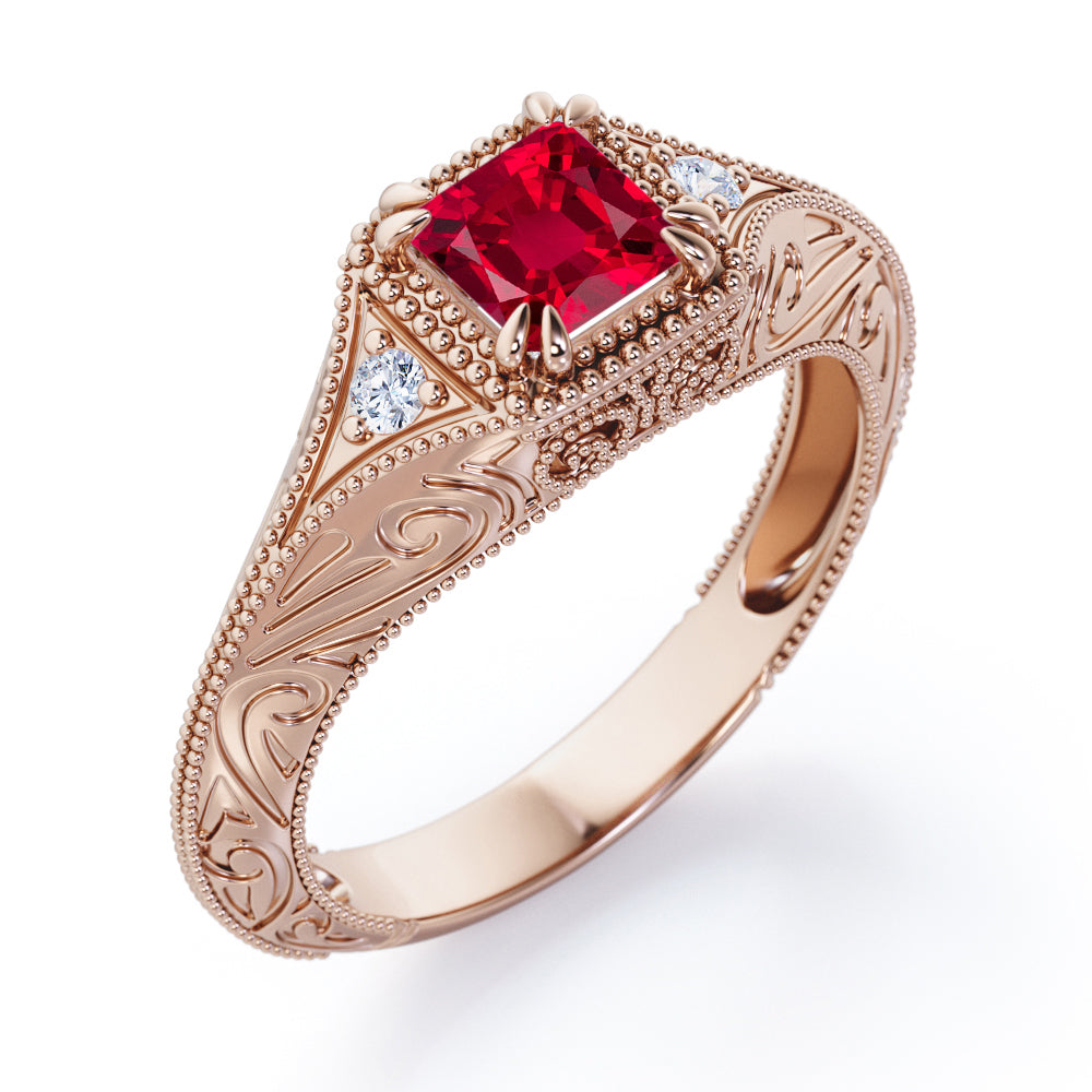 Vintage Milgrain 1.10 Carat Princess Cut Lab Ruby And Diamond Sharp Eight Claws Art Deco Engagement Ring In Rose Gold. If you’re looking for something more elaborate with a vintage flair, you will certainly love this addition to our Lab Ruby rings collection. Regal and whimsical, this engagement ring is sure to stand out. This princess cut antique ring is full of rich tones. The unique art deco work in the band offers a delicate and feminine detail and vintage aesthetic as well. The art deco in the band is a highly exceptional and commendable job of our well-experienced artisans who leaves no stone unturned to meet your satisfaction. The sharp eight claws holds the 1 carat Lab Ruby firmly allowing it to radiate immense sparkle. This vintage milgrain 1.10 carat princess cut Lab Ruby and diamond art deco engagement ring in rose gold can also be customized to 18k Gold plating over silver, 10k Gold or 14k Gold as you prefer. Please note that if the ring is made over silver, the side stone will be moissanite and if it is made on gold, diamond will be employed as the side stone. This distinctive piece is the perfect option for the bride who is both minimalistic yet unconventional.