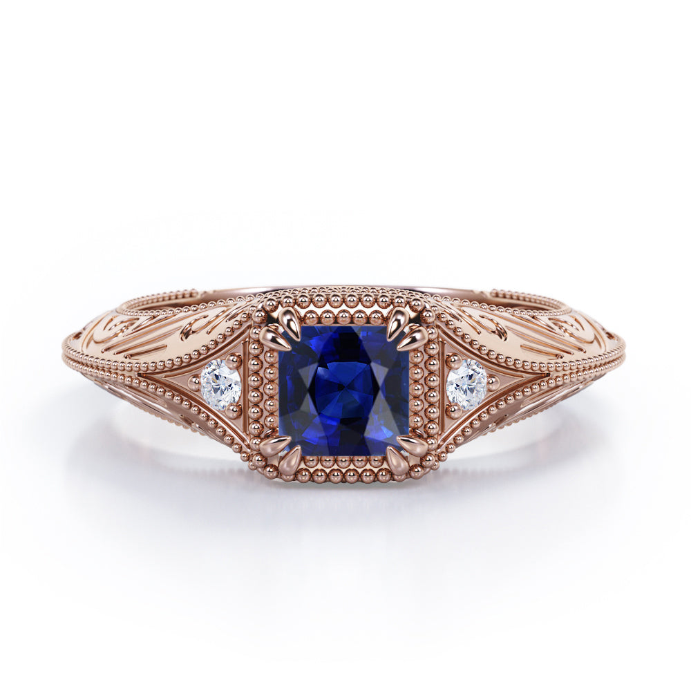 Vintage Milgrain 1.10 Carat Princess Cut Sapphire And Diamond Sharp Eight Claws Art Deco Engagement Ring In Rose Gold