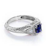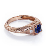 Vintage Milgrain 1.10 Carat Princess Cut Sapphire And Diamond Sharp Eight Claws Art Deco Engagement Ring In Rose Gold. If you’re looking for something more elaborate with a vintage flair, you will certainly love this addition to our Sapphire rings collection. Regal and whimsical, this engagement ring is sure to stand out. This princess cut antique ring is full of rich tones. The unique art deco work in the band offers a delicate and feminine detail and vintage aesthetic as well. The art deco in the band is a highly exceptional and commendable job of our well-experienced artisans who leaves no stone unturned to meet your satisfaction. The sharp eight claws holds the 1 carat sapphire firmly allowing it to radiate immense sparkle. This vintage milgrain 1.10 carat princess cut sapphire and diamond art deco engagement ring in rose gold can also be customized to 18k Gold plating over silver, 10k Gold or 14k Gold as you prefer. Please note that if the ring is made over silver, the side stone will be moissanite and if it is made on gold, diamond will be employed as the side stone. This distinctive piece is the perfect option for the bride who is both minimalistic yet unconventional.