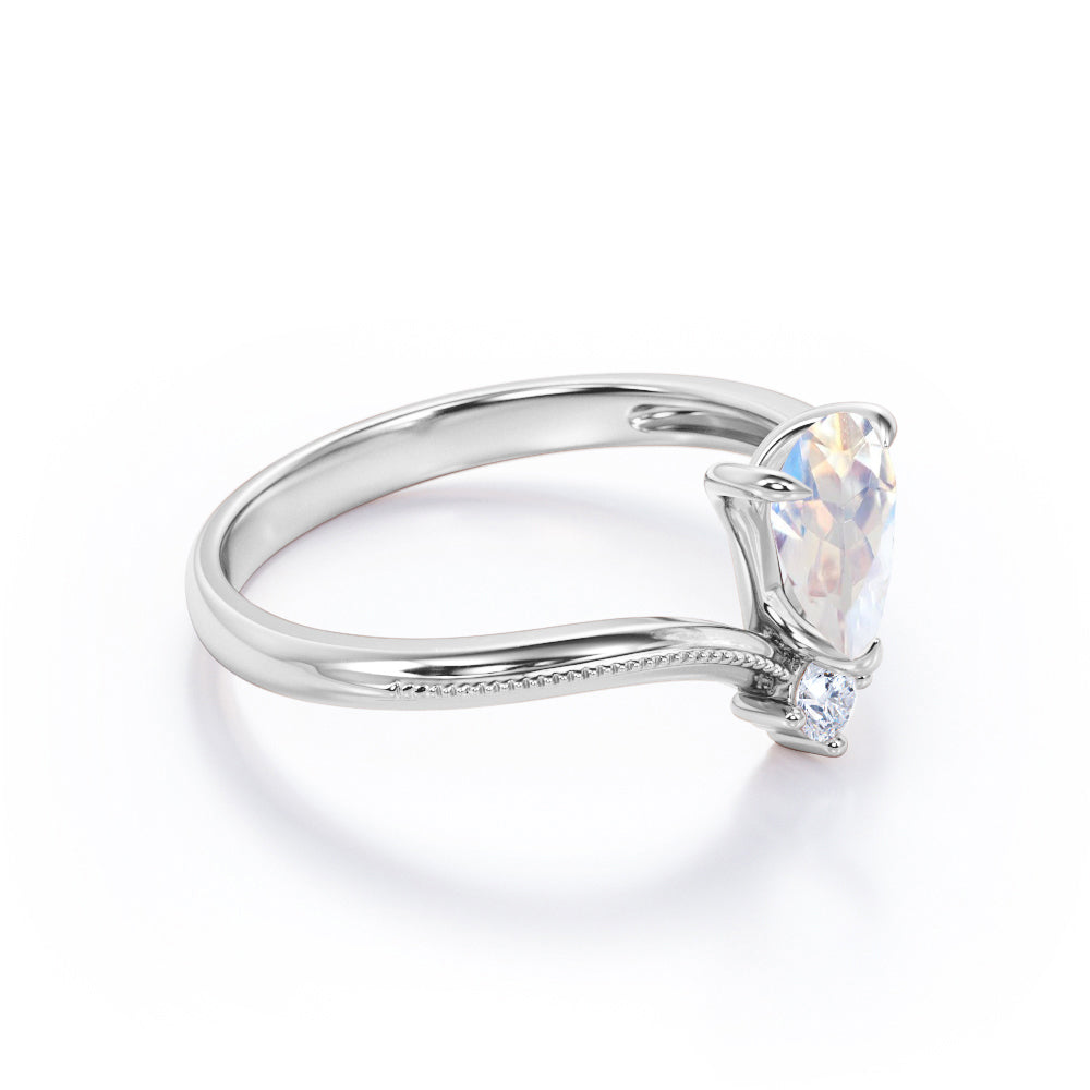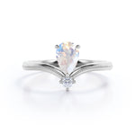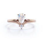 If your bride to be is a June girl, this Vintage Milgrain 1 carat Pear Moonstone Nestled Engagement Ring in Rose Gold would be a lovely choice to propose her. Moonstone is a June birthstone and a balancing gem, helping you living a fulfill life. Birth jewelry doesn't mean that it has to be boring, now adays there are many unique and creative design where you can purchase it as a gift to your beloved one like this promise ring. It holds a 1 carat pear shape of Moonstone at the band angle where it coexists and compliments each other well. A dainty round Moissanite is also flanked under center stone to complete the look and add a Milgrain decoration to the ring to add a vintage style to it. You can choose either white gold, rose gold, yellow gold or black gold to be the color of your band while it can be made in 18k gold over silver, 10k gold and 14k gold.