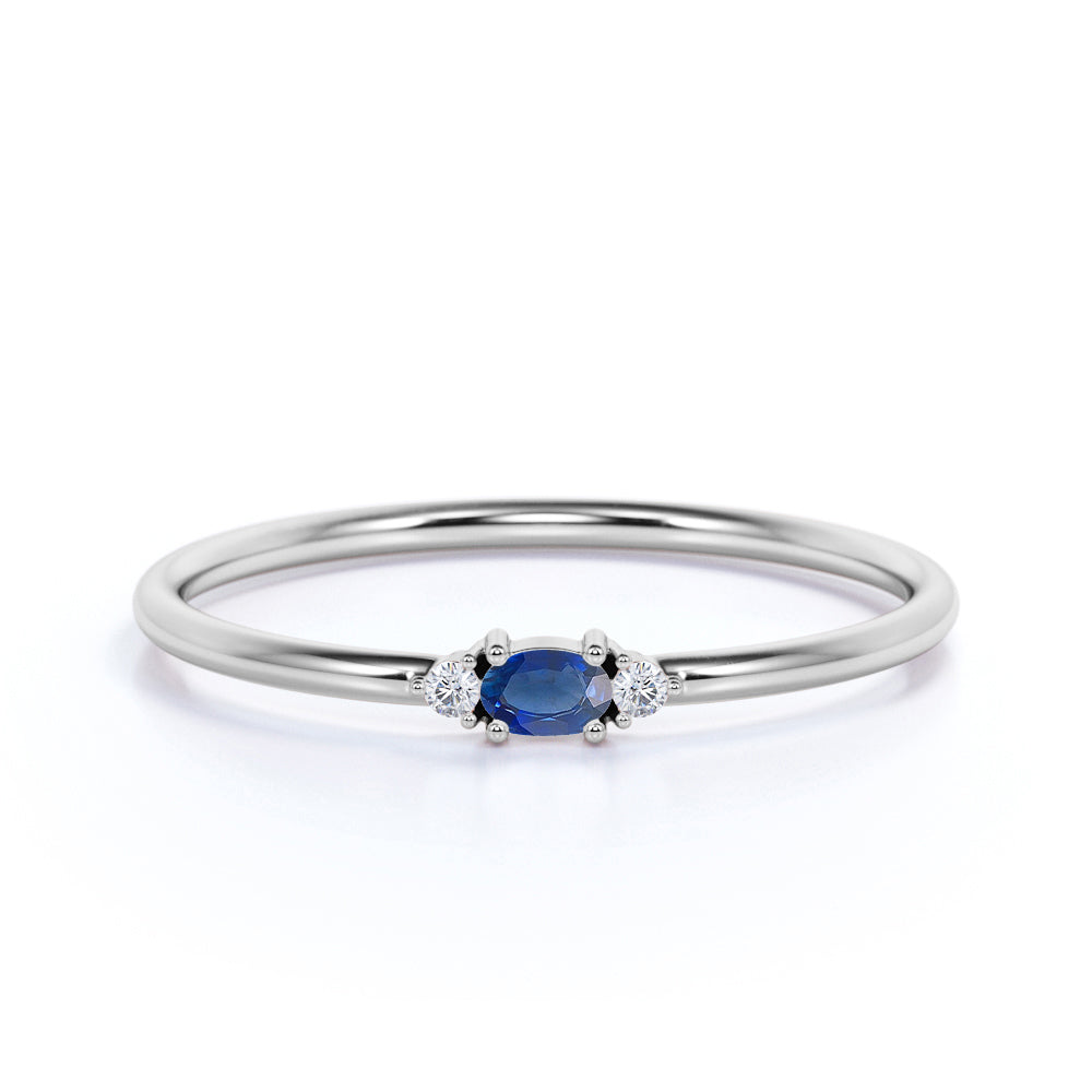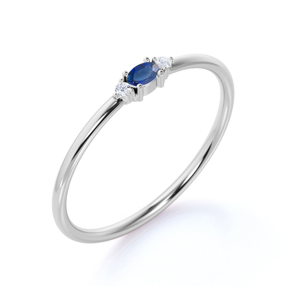 Vintage Oval Cut Purplish Blue Sapphire and 3 Stone Diamond Dainty Women's Engagement Ring in White Gold