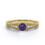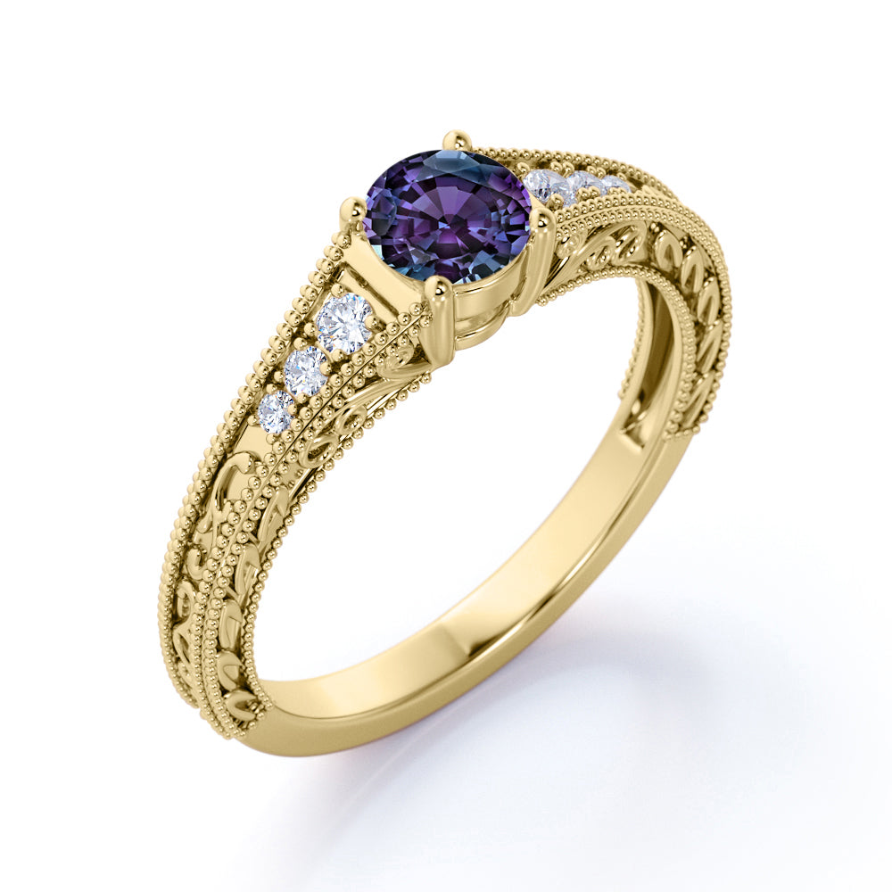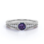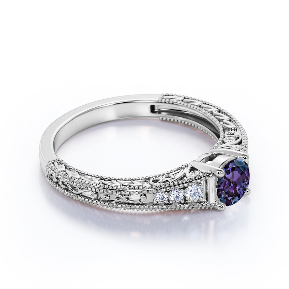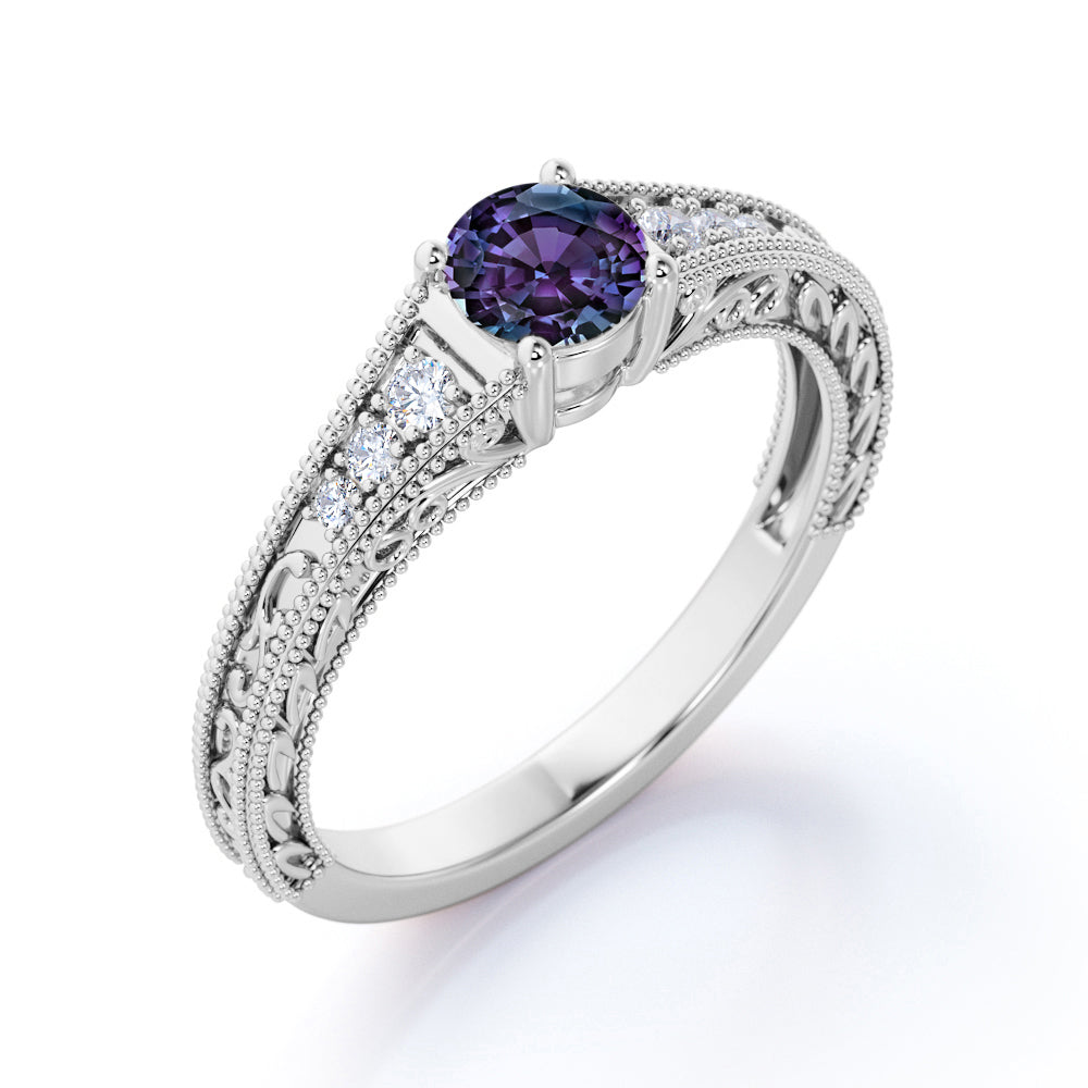 Vintage Prong Solitaire 1.25 Carat Round Cut Lab Made Purple Alexandrite and Diamond Art Deco Filigree Engagement Ring in White Gold for Her