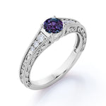 Be on cloud nine with this Vintage Prong Solitaire 1.25 Carat Round Cut Lab Made Purple Alexandrite and Diamond Art Deco Filigree Engagement Ring in White Gold for Her. This vintage prong purple Alexandrite engagement ring features 1 carat round cut synthetic Alexandrite and .25 carat real side diamond for gold ring and moissanite for silver ring. This art deco Alexandrite ring can be customized to either 10k, 14K and Gold over Silver and either Black Gold, Rose Gold, White Gold or Yellow Gold. Also, as your satisfaction is our most priority, we will do our best to have your handmade jewelry be carefully and beautifully crafted by our expert jewelers. The order also comes with a 30-day full refund policy. Perfect for any occasion, this flawless artificial Alexandrite ring can be an ideal gift for anniversary, birthday, proposal, Christmas, Valentines, mother's day and more. Design your own flawless look with this created Alexandrite ring which you can customize it as per your satisfaction. This flawless man made Alexandrite ring will be a perfect fit for you love story as it is believed that joy enters the lives of people through the stone. Ornament your love story with this stunning color changing lab made Alexandrite ring inviting more happiness and joy into your marriage life. This simulated Alexandrite ring gives a vivid grass green color in daylight and displays an intense raspberry red in candescent light. This flawless simulated Alexandrite ring will be a perfect match for those who are looking for beautiful, classic, vintage and antique synthetic Alexandrite pieces of fine jewelry. This ring will bring love and hope to its wearer. Design and create your very own unique ring that makes you outstanding from the rest! Impress your special someone with this beautiful and affordable lab created Alexandrite ring. It is the perfect match for those who are looking for a remarkable gemstone rings as Alexandrite embodies their own unique color-change ability and uplifting meaning.