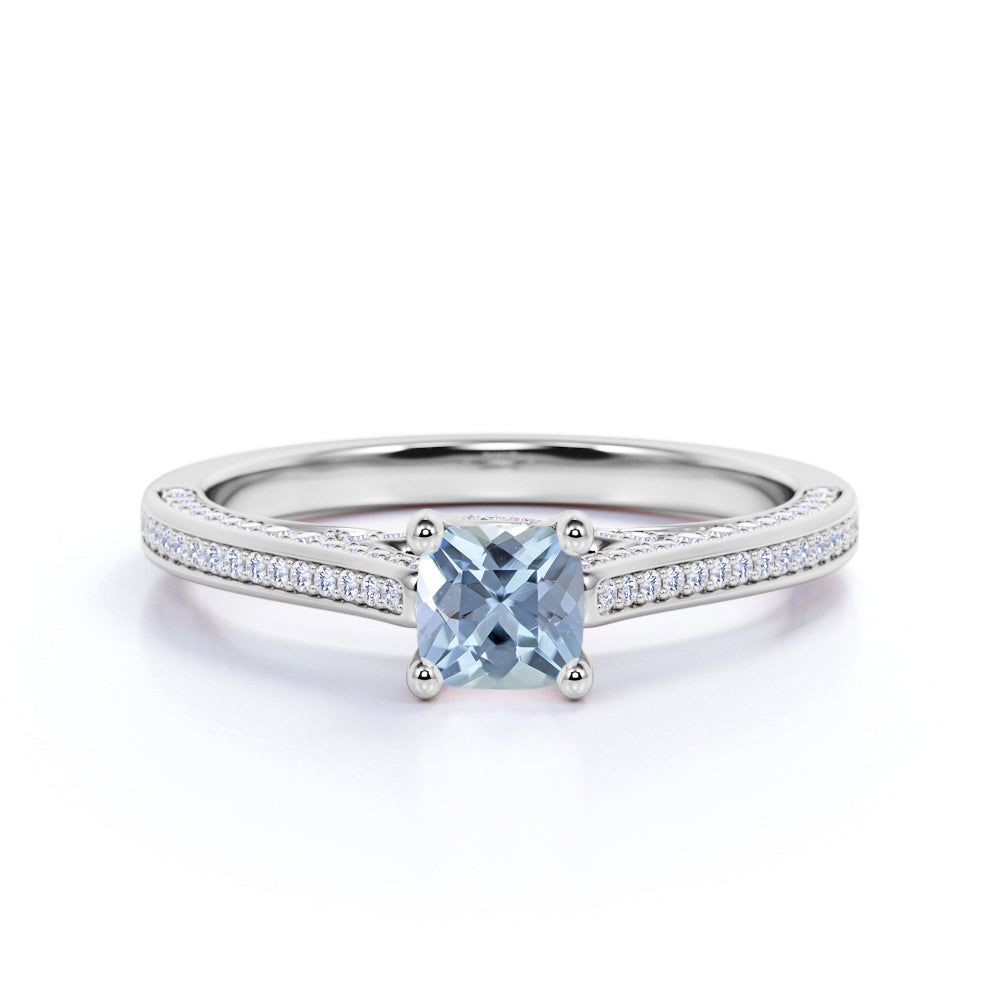 If you are done with all the unnecessary crazy design, this minimalist aquamarine ring is for you. All of our rings are genuine, real and will be certified by our company. Perfect for valentine, mother's day, anniversary gift and at a very low and inexpensive prices. This aquamarine ring features a total approximately 1.50 carat cushion cut genuine aquamarine.