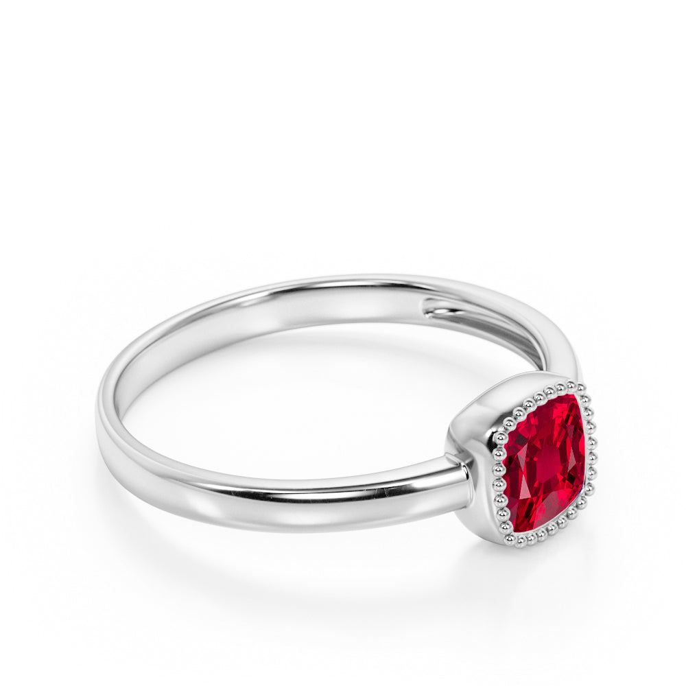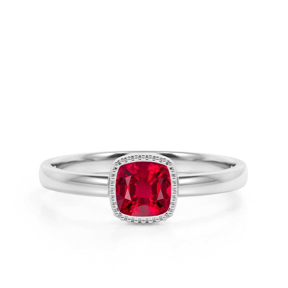 Perfect for any occasion, birthday gift, anniversary gift, promise ring or just a simple gift for your loved ones. If you don't want a modern Lab Ruby ring, this classic Lab Ruby ring is the best for you. It reminisce your past and those times when you and her are still young lovers. This Lab Ruby ring features an approximately 1.50 carat cushion cut Lab Ruby.