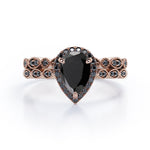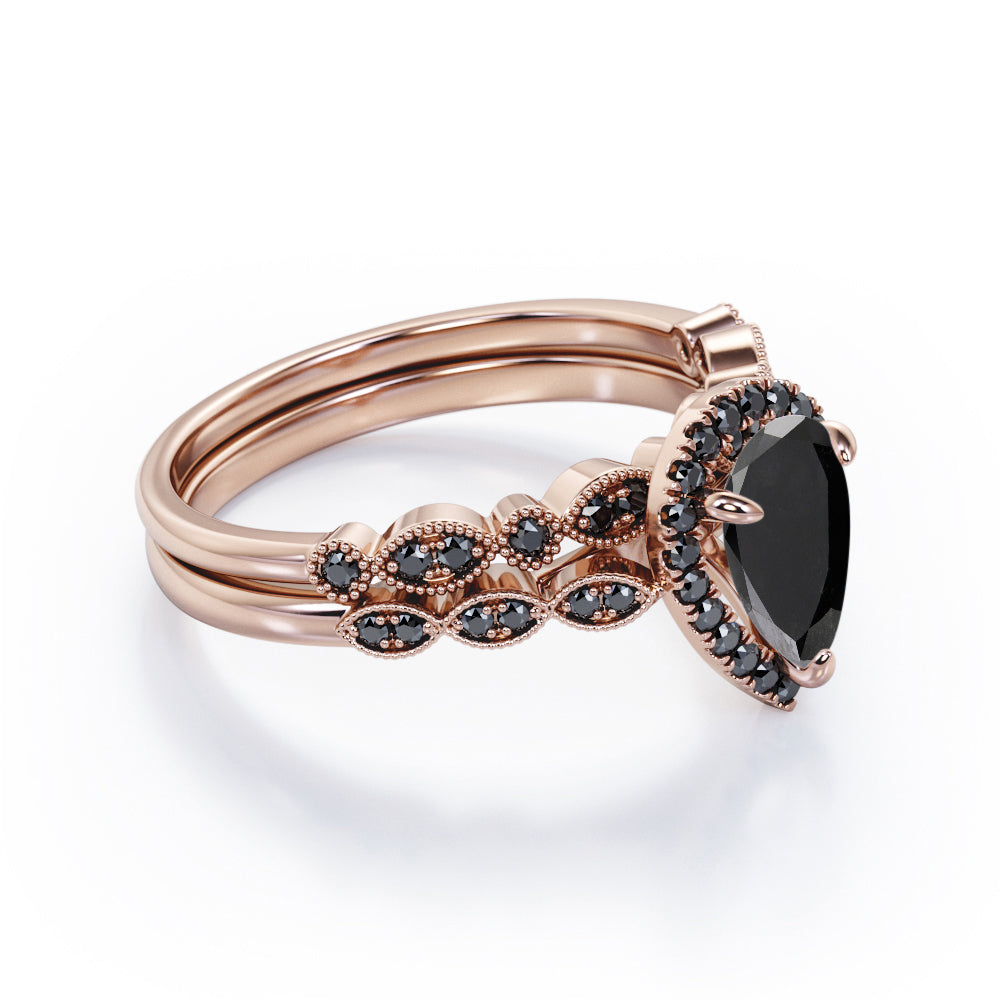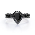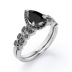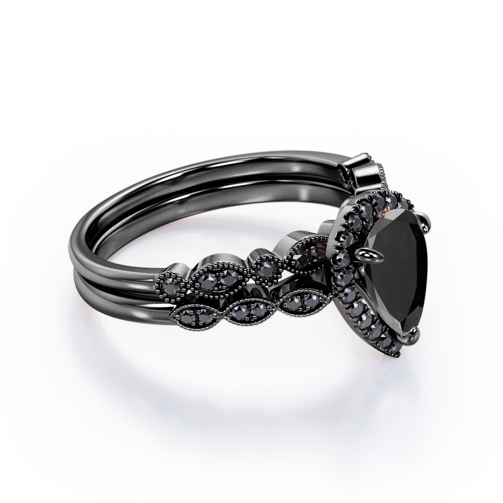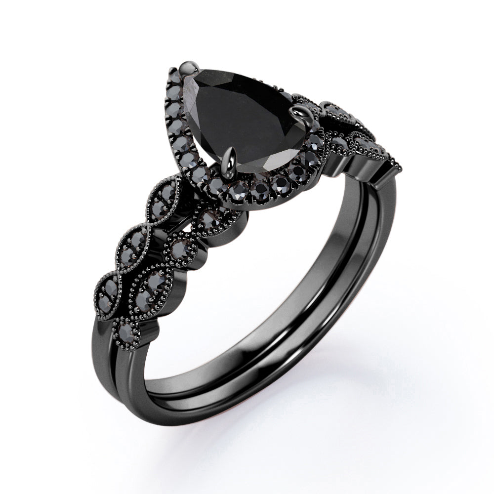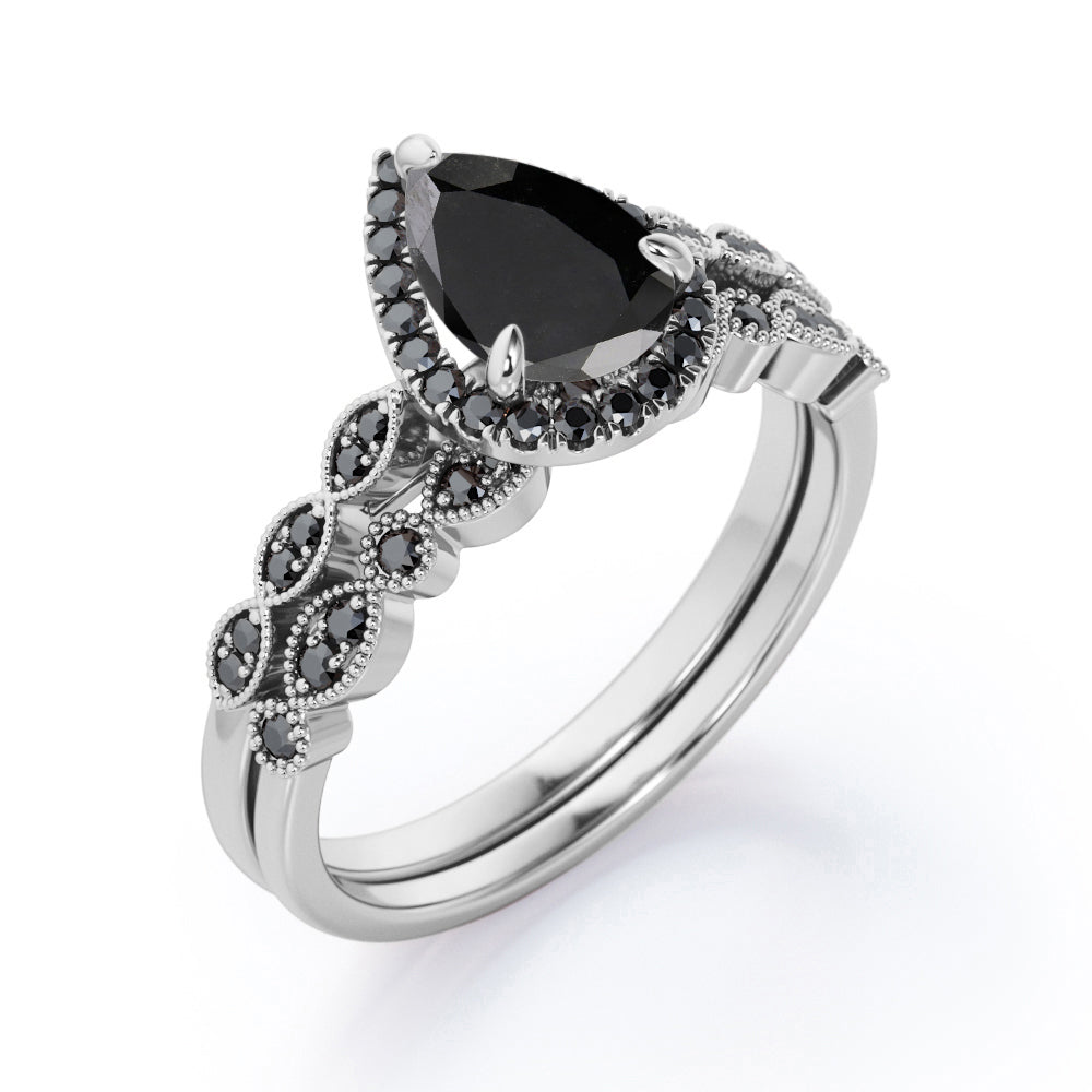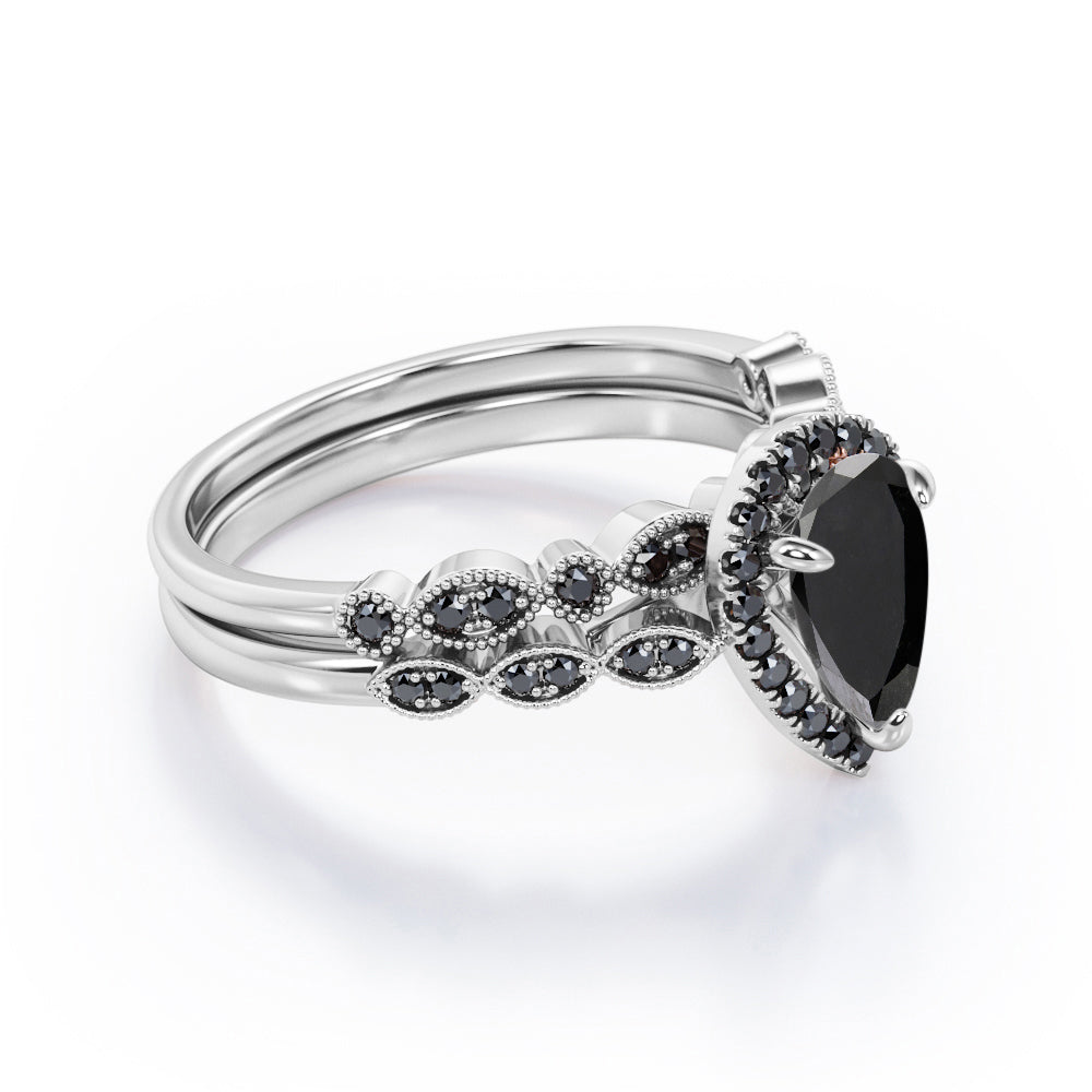 Embellish her finger with this Vintage Style - 1.65 TCW Teardrop Lab Created Black Diamond - Milgrain Halo Bridal Set in White Gold. Skillfully hand-cut into a nice pear cut by our skilled jewelers, this beautiful black diamond band set combines total 1.65 carat lab created black diamond on solid white gold. Special and non-traditional, this black diamond ring set is well-suited for those who are not quite into normal lifestyle. Reflective properties of this black diamond anniversary band set will enhance happiness and attract positive vibes. This black diamond stone engagement ring set is beautiful and accessible since it is available at an affordable price. If you are looking for a special gift for your friends or your better half, this black diamond stone engagement ring set can definitely help you out. Also, this black diamond jewelry can be customized to your own choice of metal colors: white gold, rose gold, yellow gold or black gold in 10k and 14k gold metal options. Let's fulfill your love story with this black diamond stone engagement ring set and, surely, she will not regret it.