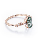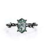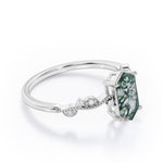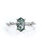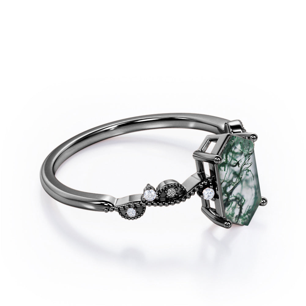 Another day, another fine jewelry. A Vintage Wavy Milgrain 1 carat Hexagon Moss Green Agate and Diamonds Engagement Ring in Rose Gold would be one of the designs that should be cherished. The antique promise ring displays a 0.5 carat Moss Green Agate gemstone in 4 prongs while the band is made into a curve line like an ocean wave by half of the band; the bending parts hold a small arch with small round diamonds inside. Both line curvy band and dome are framed by Milgrain bead decoration to add some vintage touch to the ring. Moreover, there is a petite round diamonds scatter around. The ring can be made in 18k gold over silver, 10k gold and 14k gold with the color of white gold, rose gold, yellow gold and black gold.