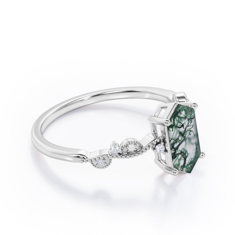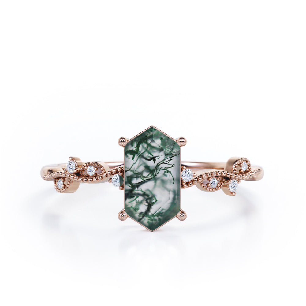 Vintage Wavy Milgrain 0.5 carat Hexagon Moss Green Agate and Diamonds Engagement Ring in Rose Gold