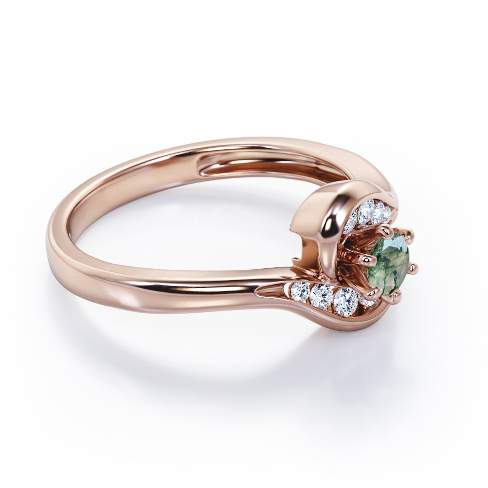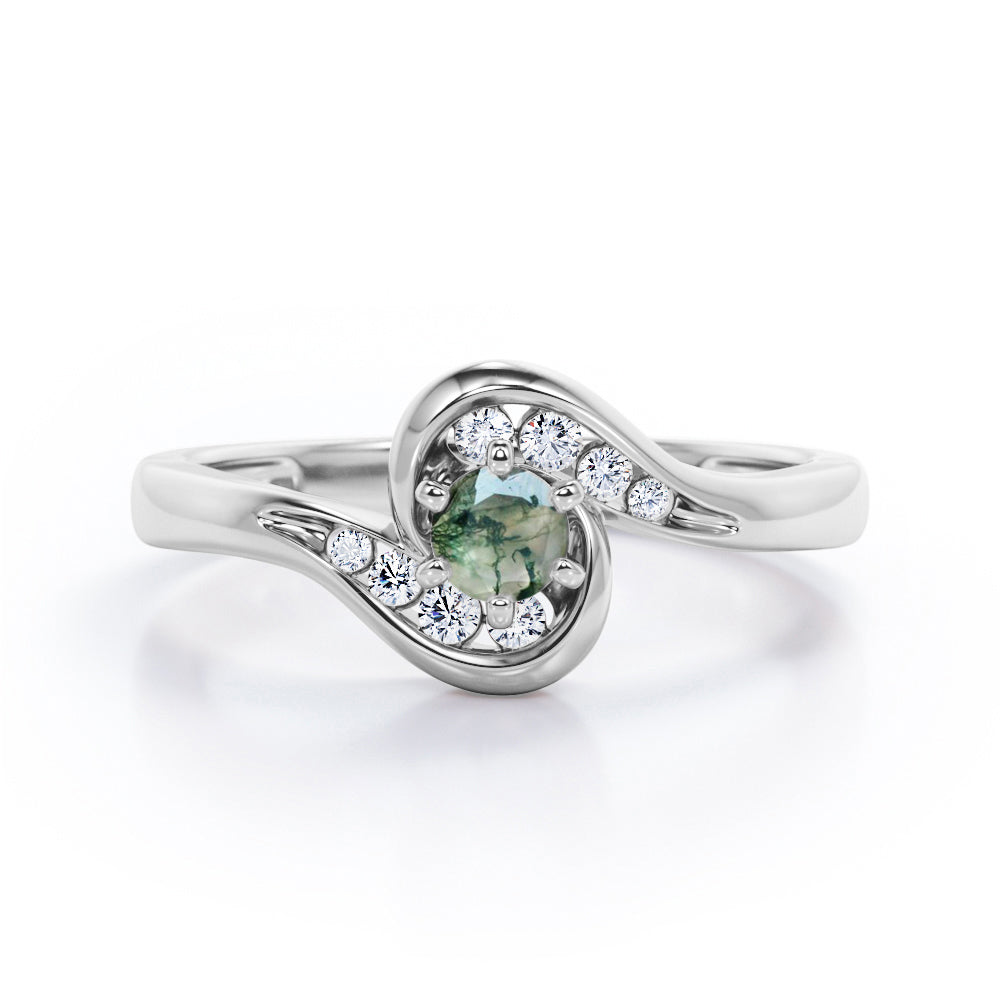 Whirly Gemstone 0.55 carat Round Green Moss Agate and Moissanites Artistic Engagement Ring in White Gold