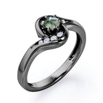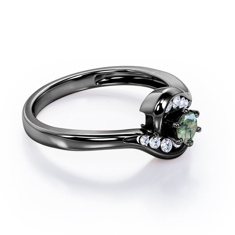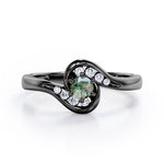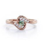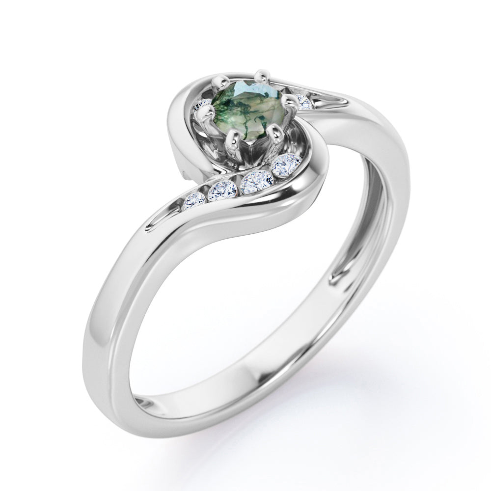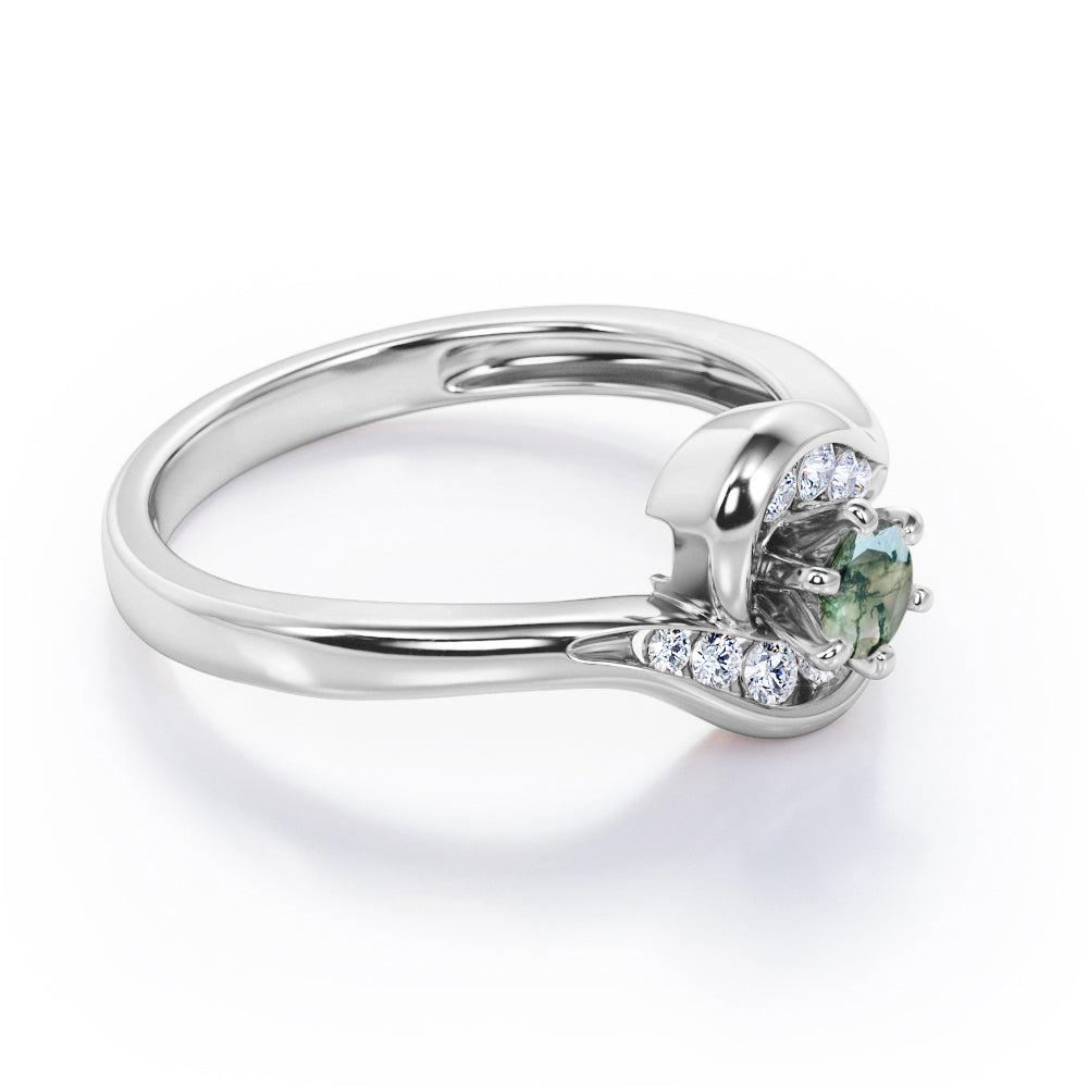 Whirly Gemstone 0.55 carat Round Green Moss Agate and Moissanites Artistic Engagement Ring in White Gold
