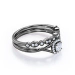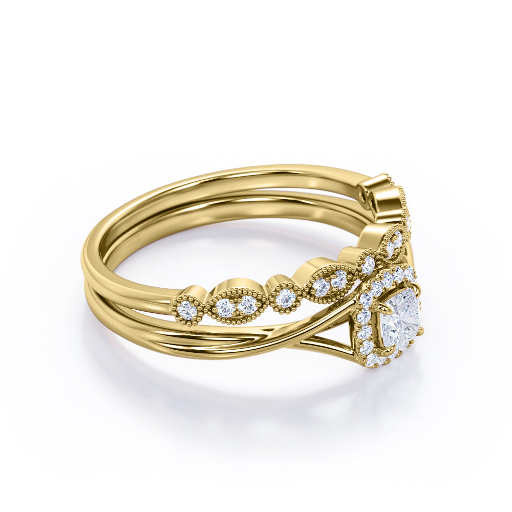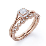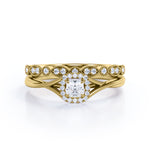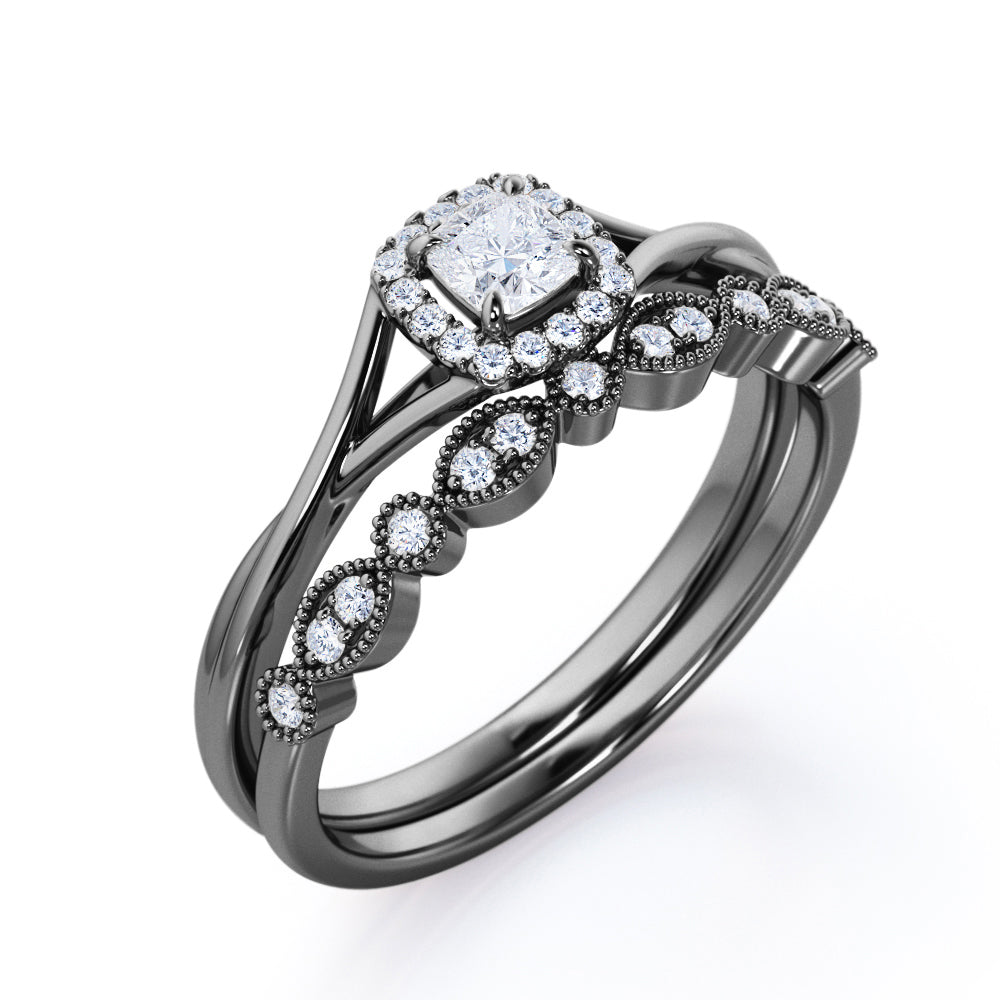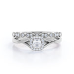 Be fashionable with the Woman's Choice 1 carat Cushion Moissanite and Diamond Halo Bridal Ring set in White Gold. The classy wedding set is skillfully crafted by our talented jeweler with care. It features an astonishing Moissanite sits atop of the chic split shank engagement ring and decorated with a glittery diamond frame. Breaking out of the ordinary look of split shank ring, the bands are united with twisting technique, giving a playful look to the ring. Comes with promise ring is a Milgrain marquise wedding band which holds flushed round brilliant diamonds within. Both rings can be customized to your choice of 18k gold over silver, 10k gold, 14k gold and 18k gold and you can pick either white gold, black gold, yellow gold or rose gold for your fine jewelry.