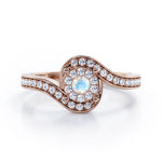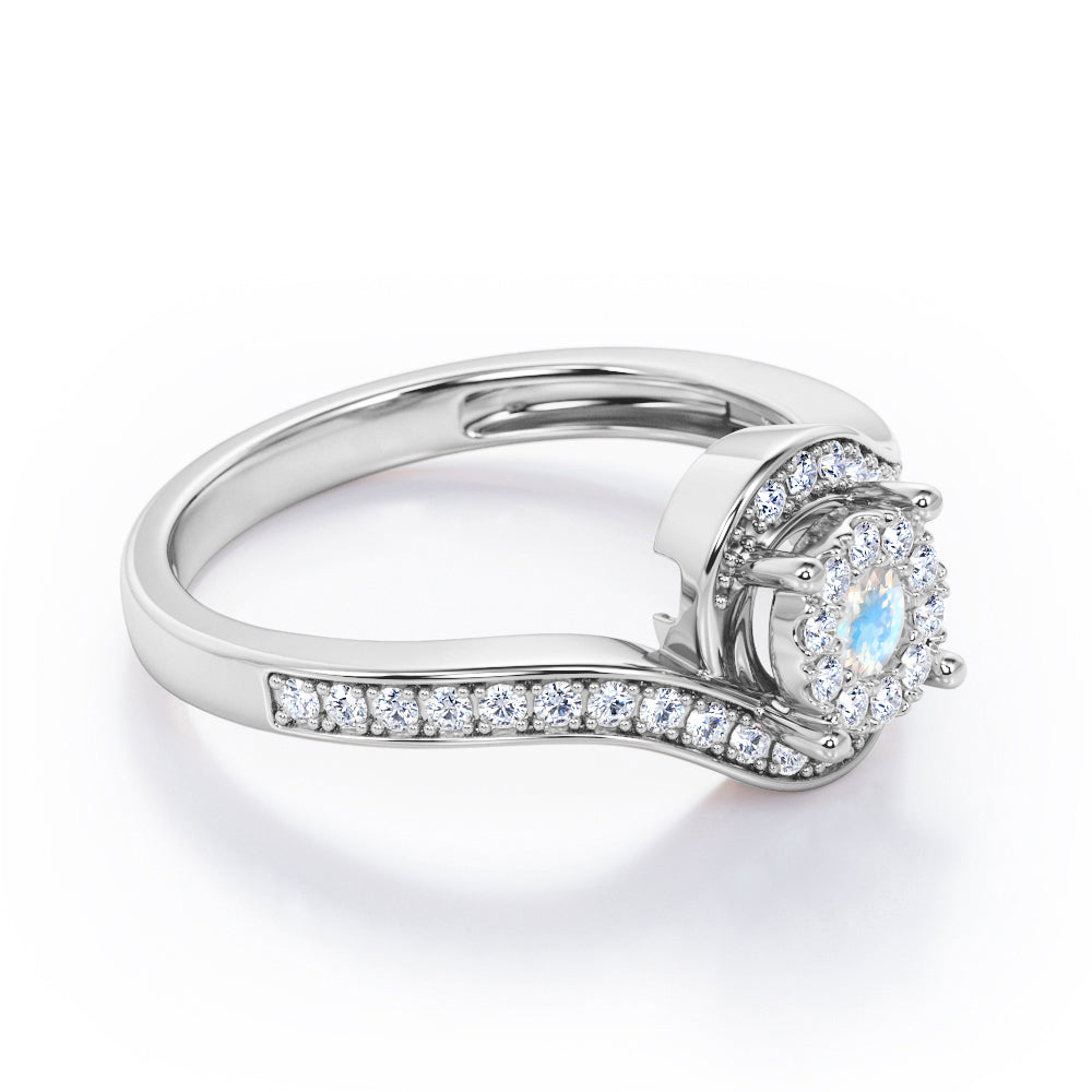 Promise to lover her forever with this Wrapped Round 0.65 carat Round Moissanite and Diamonds Bypass Engagement Ring in Rose Gold. A 0.33 carat round Moonstone is surround by Moissanite halo and another layer of contoured band that encompass around the center stone. A classic bead setting of round dainty Moissanite is a combination of prong and channel setting. Petite round Moissanite stones are placed by half of the s-curved shank, making it looks like a flowing river that glistens along the line. This beautiful Moissanite promise ring can be customized to your choice of 18k gold over silver, 10k gold and 14k gold with the color of white gold, rose gold, yellow gold and black gold.