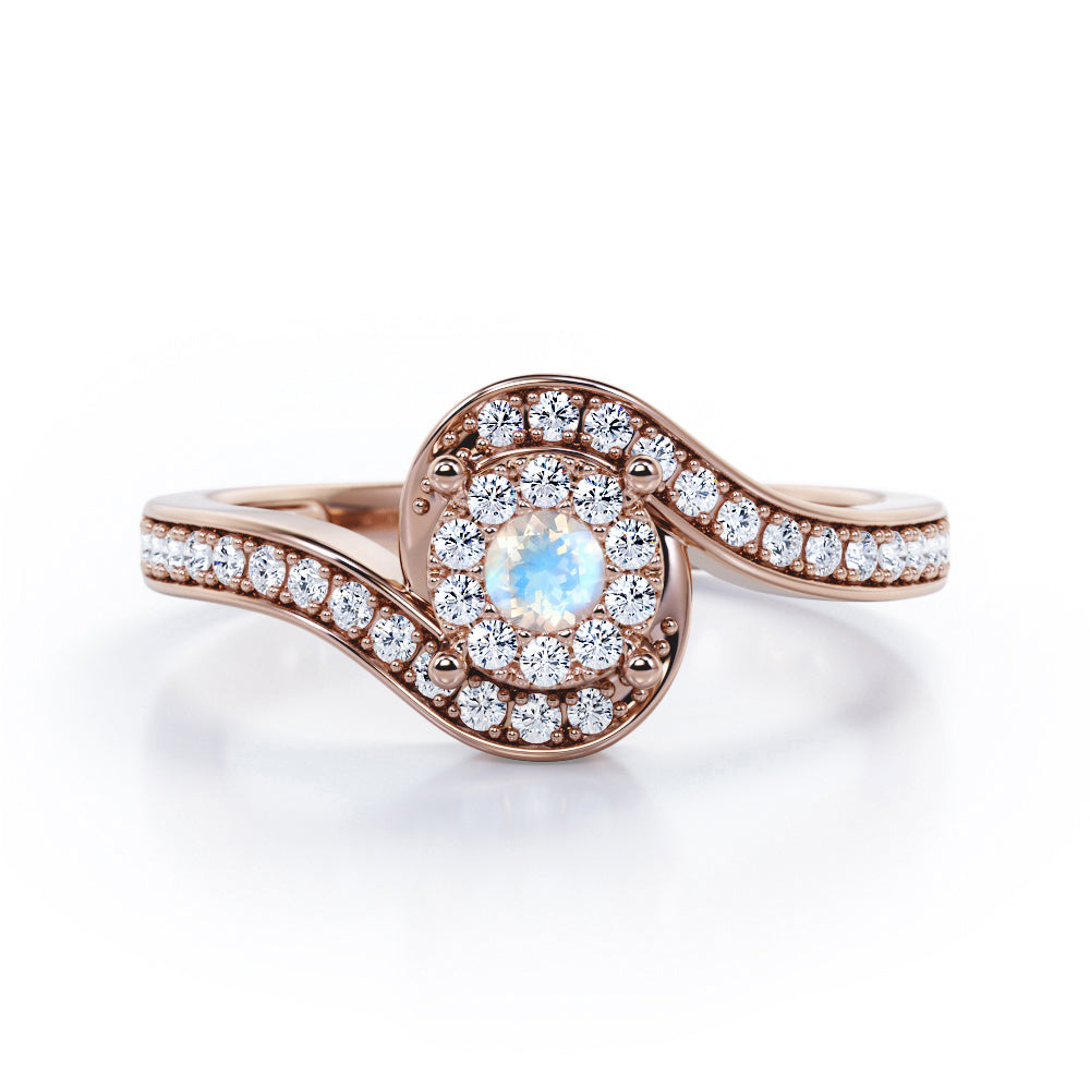 Wrapped Round 0.65 carat Round Moonstone and Moissanites Bypass Engagement Ring in Rose Gold
