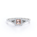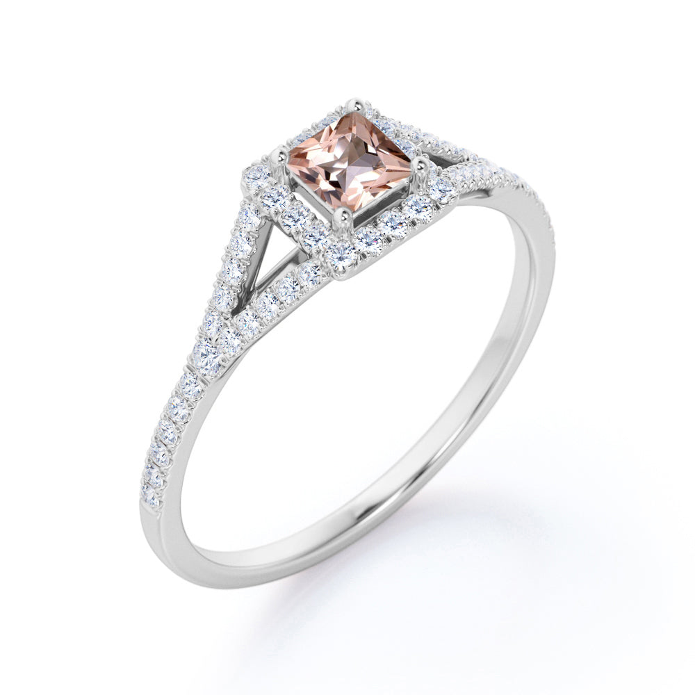 Cheers to the happy time with a Y-Shaped Split Shank 1 carat Princess Morganite and Moissanite Engagement Ring in White Gold features a 0.5 carat princess Morganite in the center where it is surrounded by square paved round Moissanite frame. The band is split, making it looks like two glasses of wine that come celebrating together for your special moment. Paved round Moissanite adorn along the band by half of it, adding sparkle to the promise ring. It can be made in 18k gold over silver, 10k gold and 14k gold with the color of white gold rose gold and black gold.