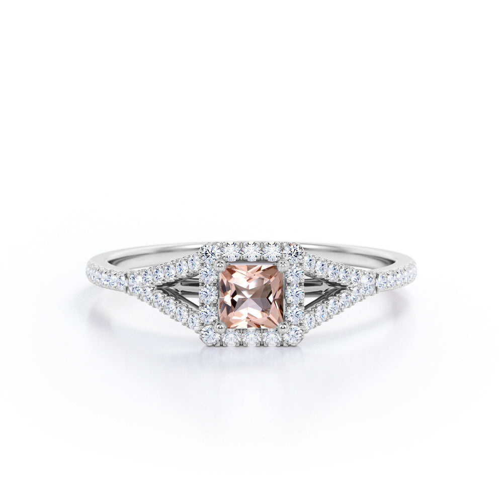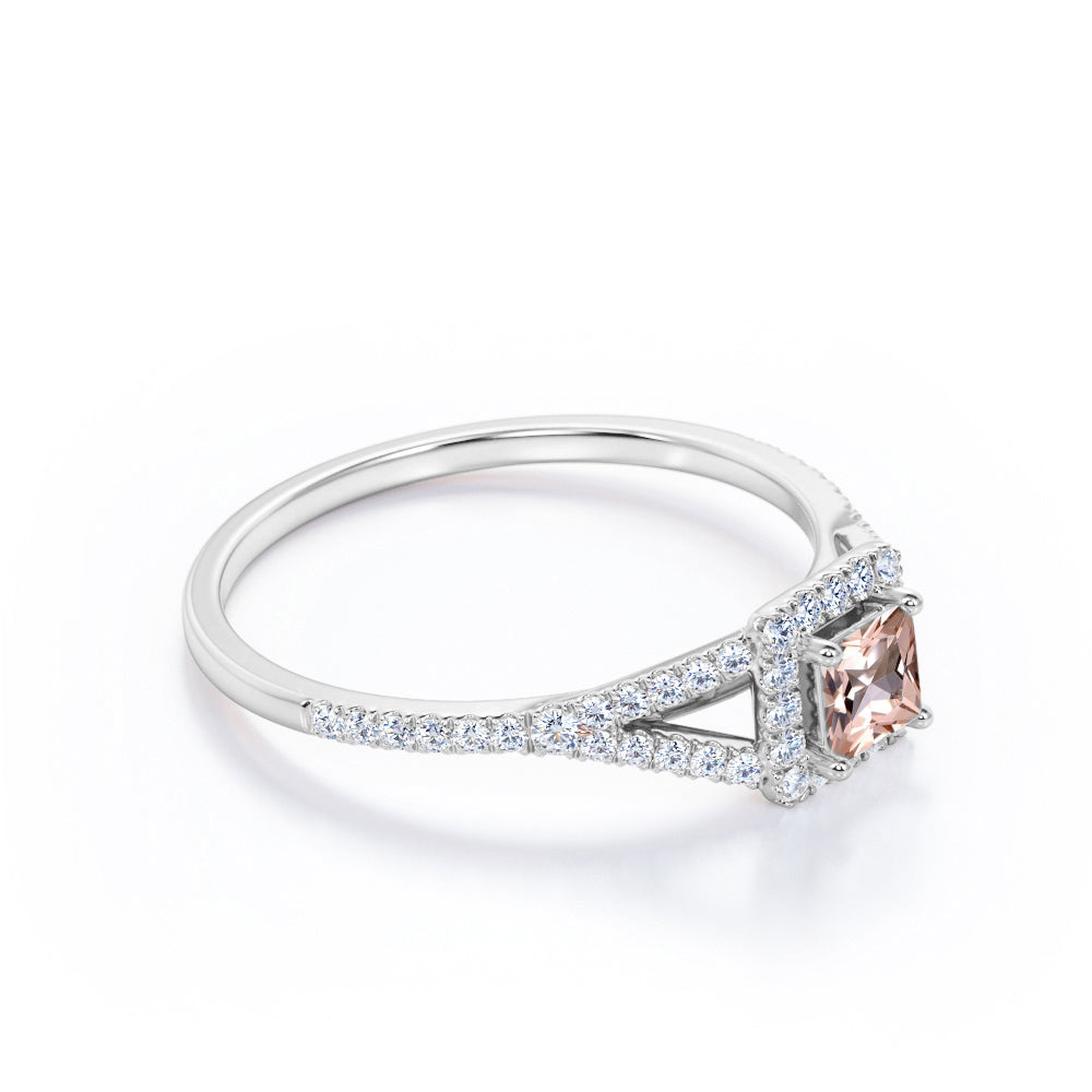 Y-Shaped Split Shank 1 carat Princess Morganite and Moissanite Engagement Ring in White Gold