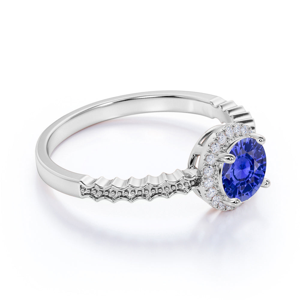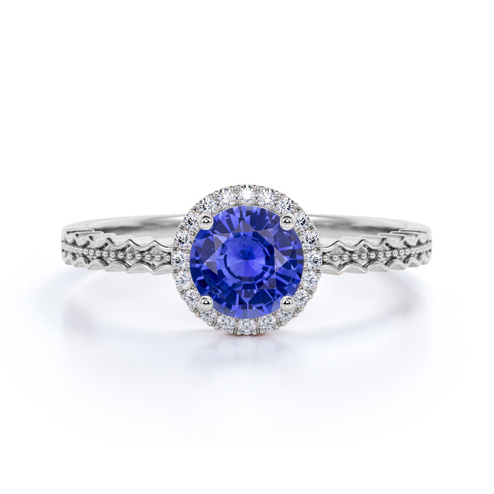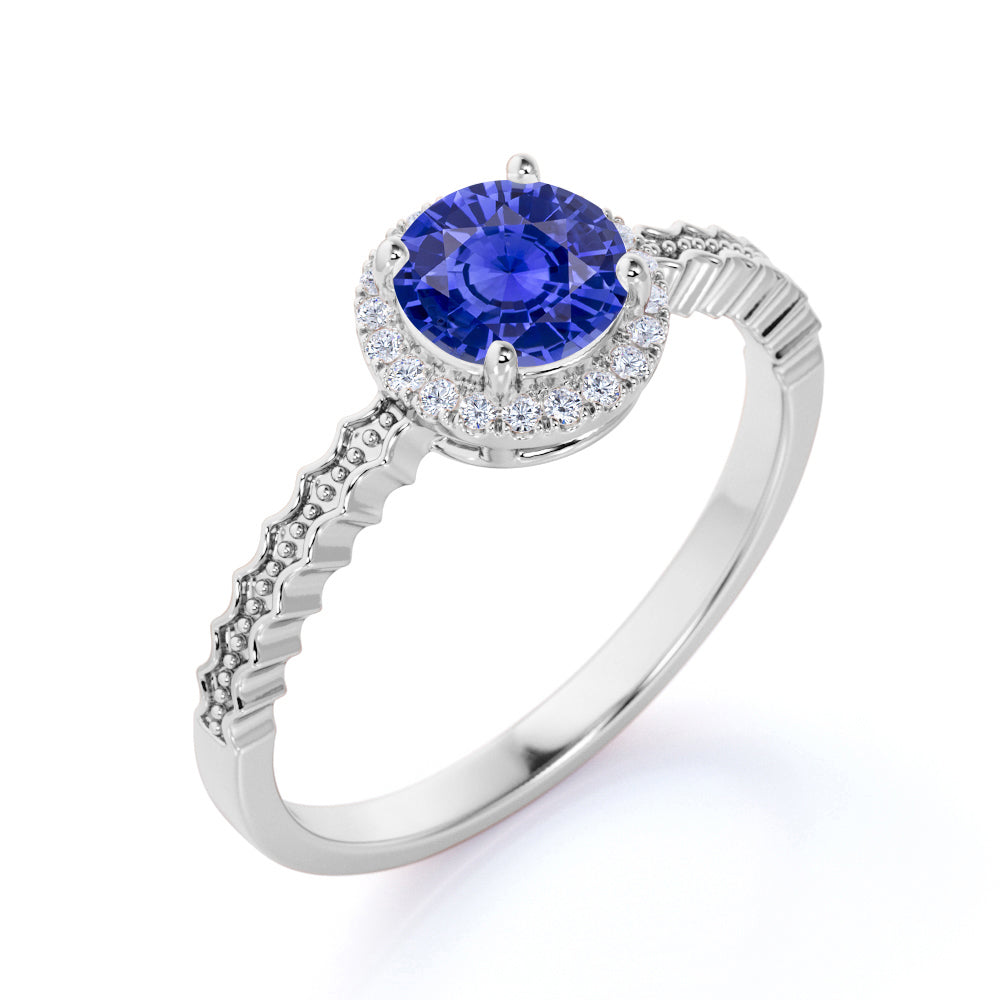 The vintage blue Lab-Created sapphire ring is quite amazing, since majority of us likes to see a vintage look, especially with an engagement ring that is absolutely beautiful. The antique style blue sapphire ring is very famous worldwide and this design is one of our bestselling. This blue sapphire ring features an approximately 1 carat round shaped certified blue Lab-Created sapphire, surrounded by 0.15 carat authentic side diamonds, for a total weight of 1.15 carats.